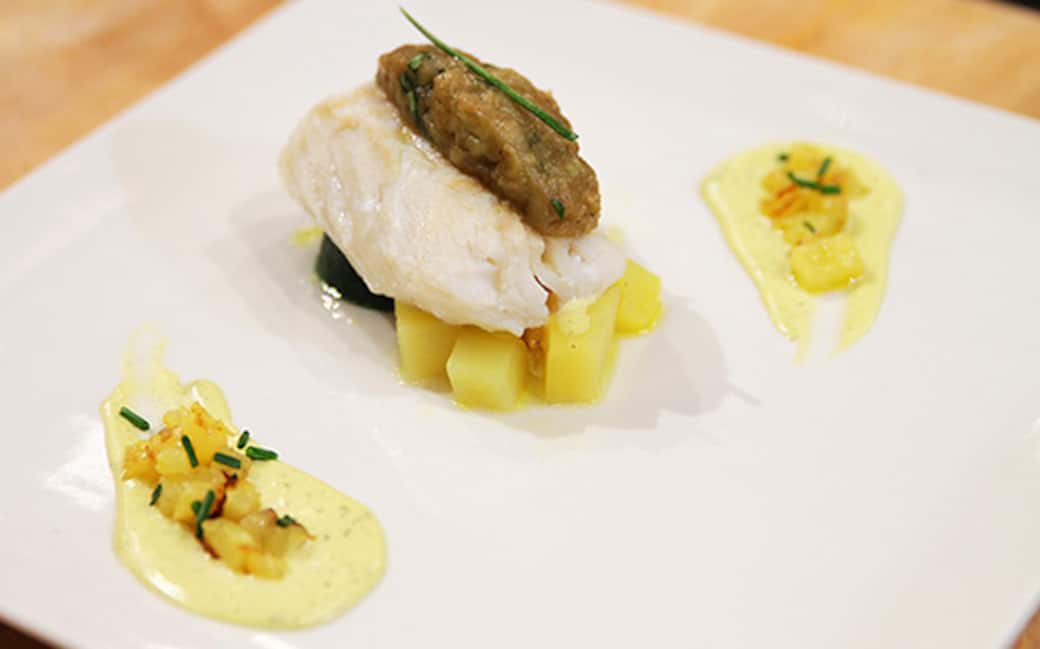 Mettere al centro di ogni piatto alcuni dadini di patate e zucchine, qualche goccia di maionese e la salsa di ananas. Posizionare il filetto di baccalà sopra le verdure e ancora sopra una quenelle di purea di melanzane. Guarnire con la maionese di pelle di baccalà , la salsa all’ananas e erba cipollina.