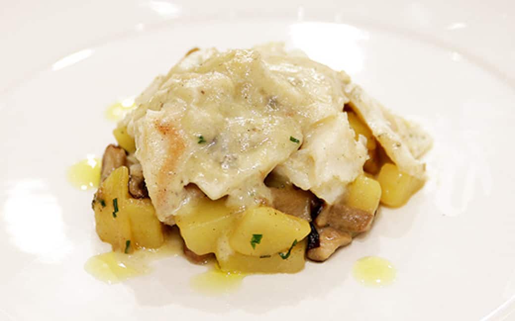 Servire il baccalà mantecato nel la sua crema accompagnandolo con la dadolata di patate e funghi Shiitake.