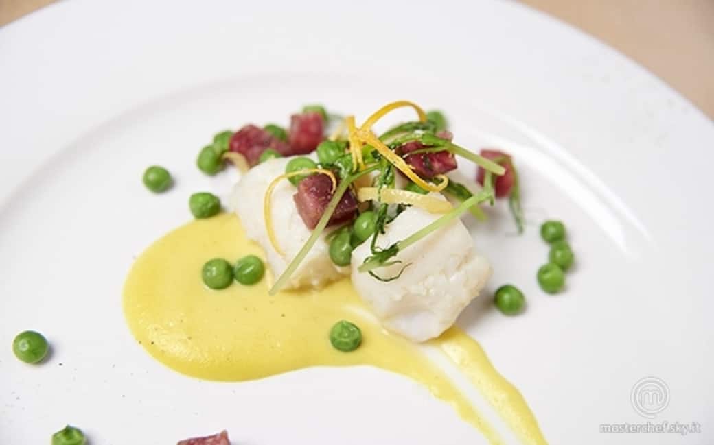 Impiattare sistemando la crema di patate alla base del piatto, appoggiare sopra un cubo di baccalà, condire con il sale maldon. Sistemare intorno l’insalata di finocchiona e piselli, finire con una grattata di pepe e un po’ di scorza di agrumi.