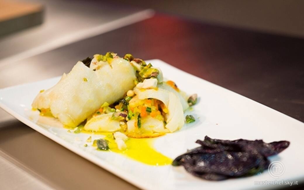 Lavare il baccalà e liberarlo dalla pelle. Con un coltello affilato e flessibile dividerlo in filetti. Dorare in una padella con sufficiente olio extravergine, lo scalogno, il sedano e, in successione, la carota e la zucchina (tagliate a dadini piccolissimi). Quando le verdure sono quasi cotte, aggiungere la mela annurca (a tocchetti un po’ più grandi), aggiungere i pinoli e il basilico e la menta strappati grossolanamente e aggiustare con il sale di Salina.