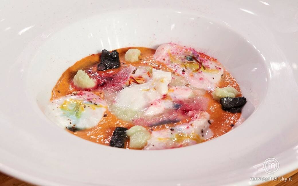 Impiattare il baccalà e aggiungere la crema di champignon, la crema di cavolfiore e il lardo al nero di seppia. Aggiustare di olio evo, sale e pepe.