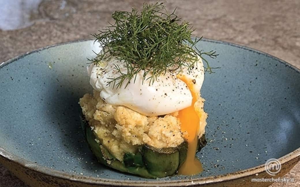 In ogni fondina disporre un fondo di carciofo, versarvi una cucchiaiata di baccalà mantecato e completare con l’uovo che dovrà essere rotto delicatamente per aprirsi sul baccalà (l’uovo cotto nell’acqua a 65 °C avrà una consistenza compatta ma gradevolmente cremosa, sia nel tuorlo sia nell’al- bume). Guarnire con i germogli di porro e servire.