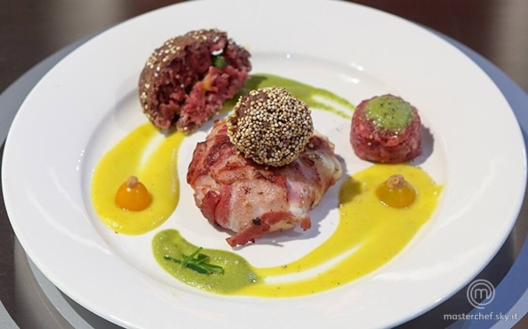 Con la carne macinata ottenere due polpette ripiene di pomodorini e peperoni, panarle con il pangrattato e la quinoa, friggerle in abbondante olio di semi.