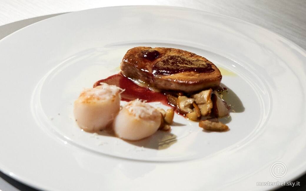 Impiattare disponendo su un lato la salsa ai frutti di bosco, i funghi e la scaloppa di foie gras e sull'altro le capesante con il battuto. Aggiustare di olio evo, sale pepe.