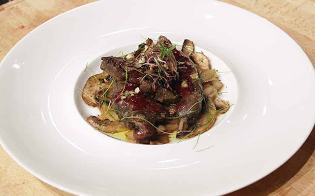 Adagiarvi sopra i bocconcini di lepre e condire con una riduzione di aceto balsamico e frutti rossi frullati.