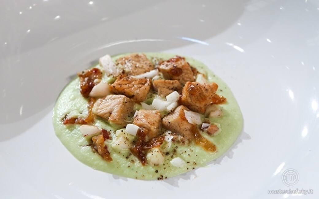 Sbollentare il broccolo e sbianchirlo in acqua e ghiaccio. Frullare con la panna, sale, pepe e un po' di aceto.