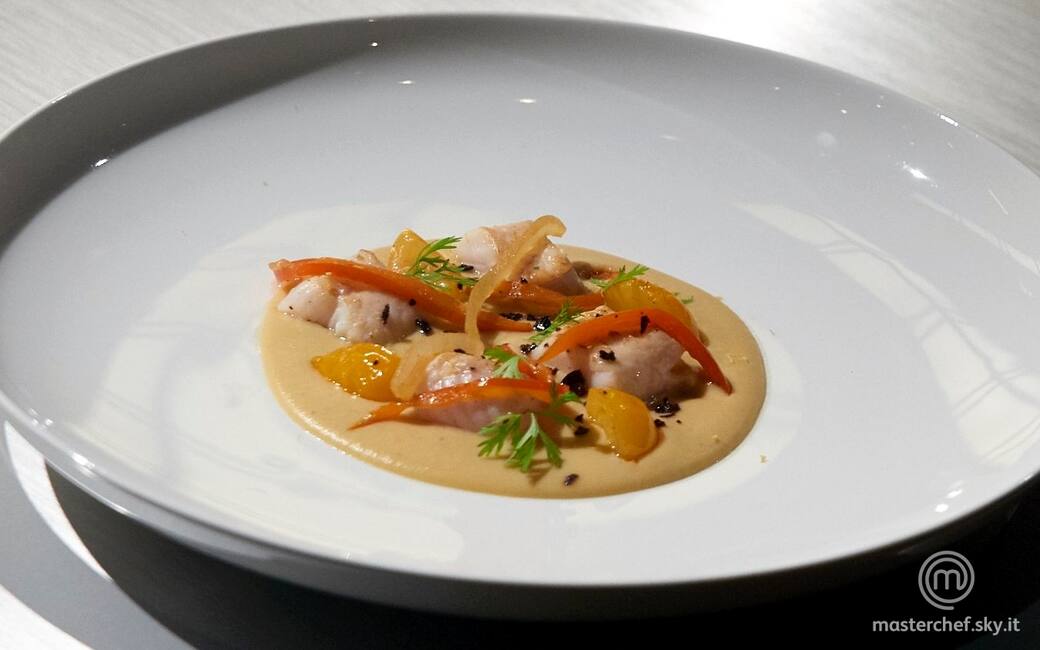 Impiattare disponendo un disco di crema di ceci nel piatto, i bocconcini di San Pietro, il peperone, la cipolla e i pomodorini e il crumble di olive. Aggiustare di olio evo, sale e pepe e completare con le zest di limone. Decorare con germogli misti.