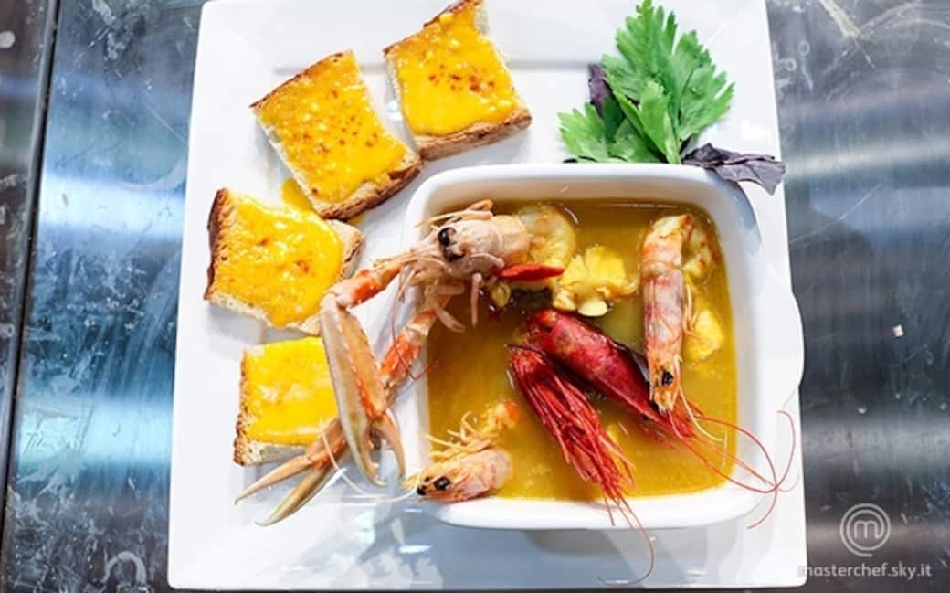 Cuocere nel brodo tutti i pesci avendo cura di metterli in ordine di cottura: prima la rana pescatrice, poi lo scorfano, la gallinella, la morchella, gli scampi, e i gamberi.