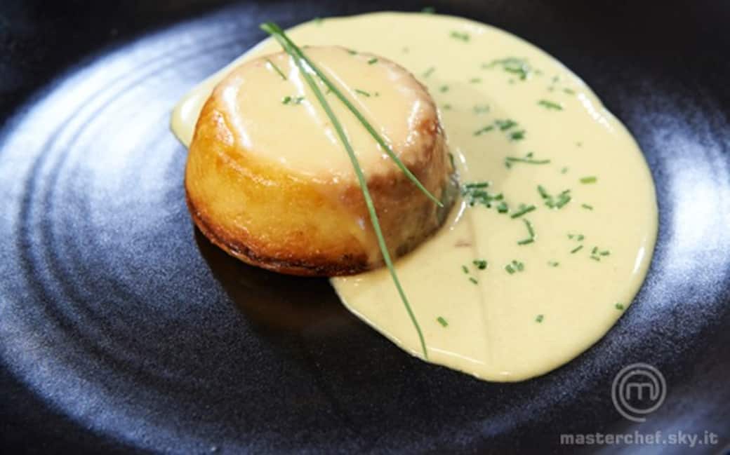 Unire due tuorli in una casseruola sul fuoco, aggiungere del brodo di pollo precedentemente preparato, il parmigiano e della noce moscata. Togliere dal fuoco. Impiattare i budini e versarvi sopra lo zabaione. Finire con dell’erba cipollina come decorazione.