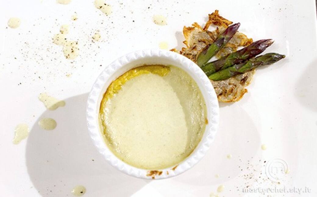 Sbollentare gli asparagi, conservare 4 punte per la decorazione, tagliare le restanti parti a pezzetti e rosolarli in padella con aglio, olio evo e cipolla. Aggiungere poco latte di asina e lasciar cuocere per 10 minuti. Frullare tutto con il mixer a immersione, aggiungere due cucchiai di formaggio ficu e setacciare. Aggiustare di sale.
