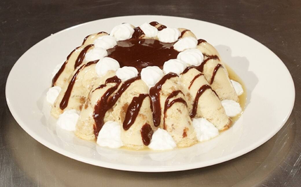 Versare il composto in uno stampo da budino imburrato e cuocere a bagnomaria posizionando lo stampo in contenitore da forno riempito con dell’acqua bollente. Infornare il budino di panettone a 200 gradi per 40 minuti.
