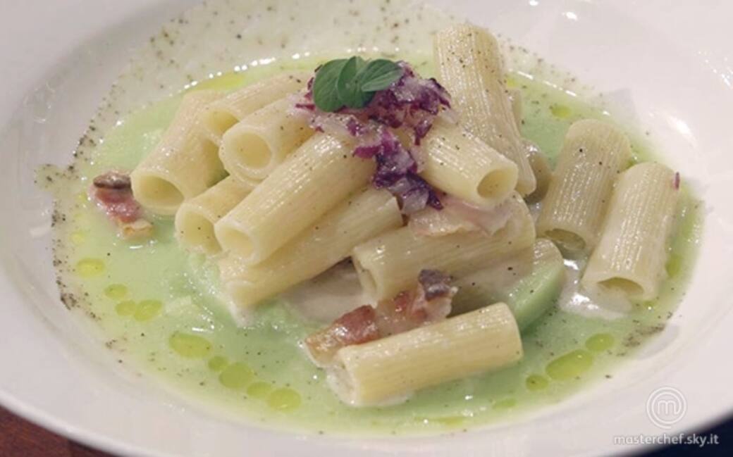 Scolare i rigatoni, saltarli in padella con il guanciale croccante e unire la crema di pecorino romano.