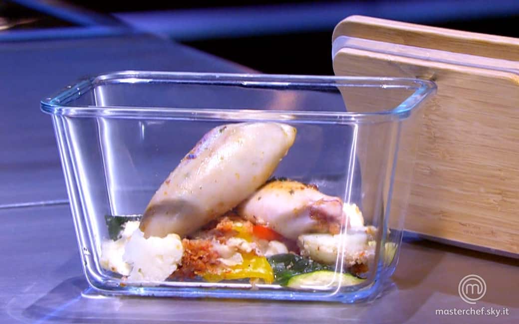 Estrarre dal forno le verdure e impiattare insieme ai calamari.