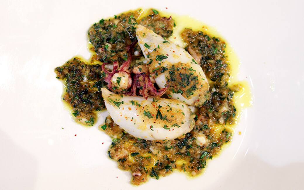Per i calamari ripieni: pulire e spellare i calamari staccando sia i tentacoli che le ali e asciugarli.Fare un soffritto di scalogno, cipolla e aglio. Quando è cotto unire il timo, il prezzemolo tritato, il peperoncino, i tentacoli e le ali dei calamari a pezzi piccoli. Sfumare con vino, unire pangrattato, sale e olio e acqua se necessario. Riempire i calamari e posizionarli in una placca da forno, disponendo il ripieno avanzato sopra e intorno ai calamari stessi. Far cuocere a 200 gradi per circa 10 minuti.