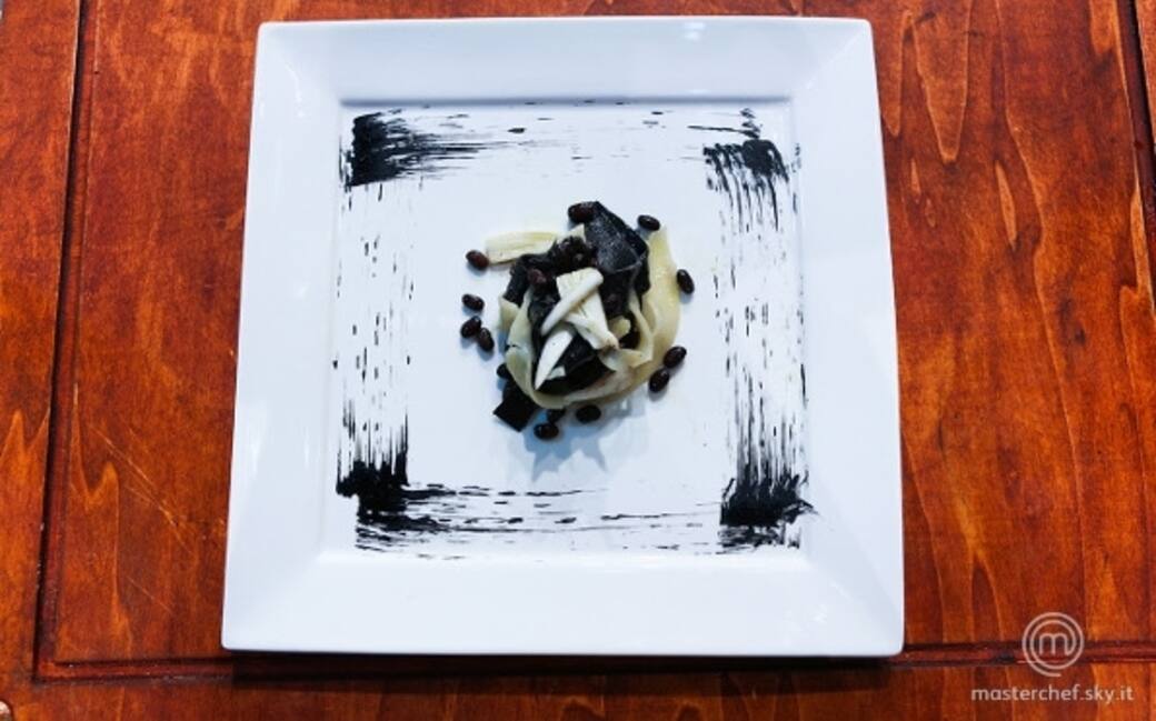 Impiattare la pasta bicolore al centro di un piatto quadrato. Versare il condimento di fagioli, aglio e cioccolato e decorare con l'indivia cruda. Decorare i bordi del piatto con delle pennellate di nero di seppia.