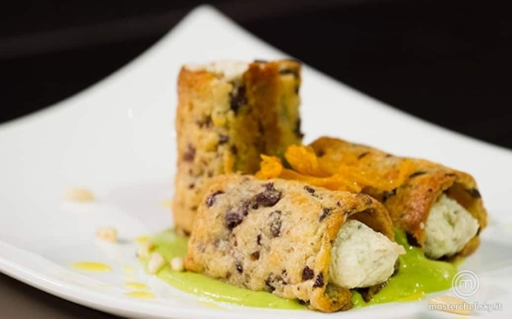Per il cannolo: amalgamare la farina e il grana, aggiungere la panna, le olive tritate finemente e il burro pomata. Stendere a circa un centimetro di spessore aiutandosi con la carta da forno e cuocere in forno caldo a 180° per 4 minuti. Far raffreddare e, con l'aiuto dei cannoli in acciaio unti, formare 8 cannoli di circa 6 centimetri di lunghezza, rimettere in forno e cuocere circa 15 minuti fino a doratura.