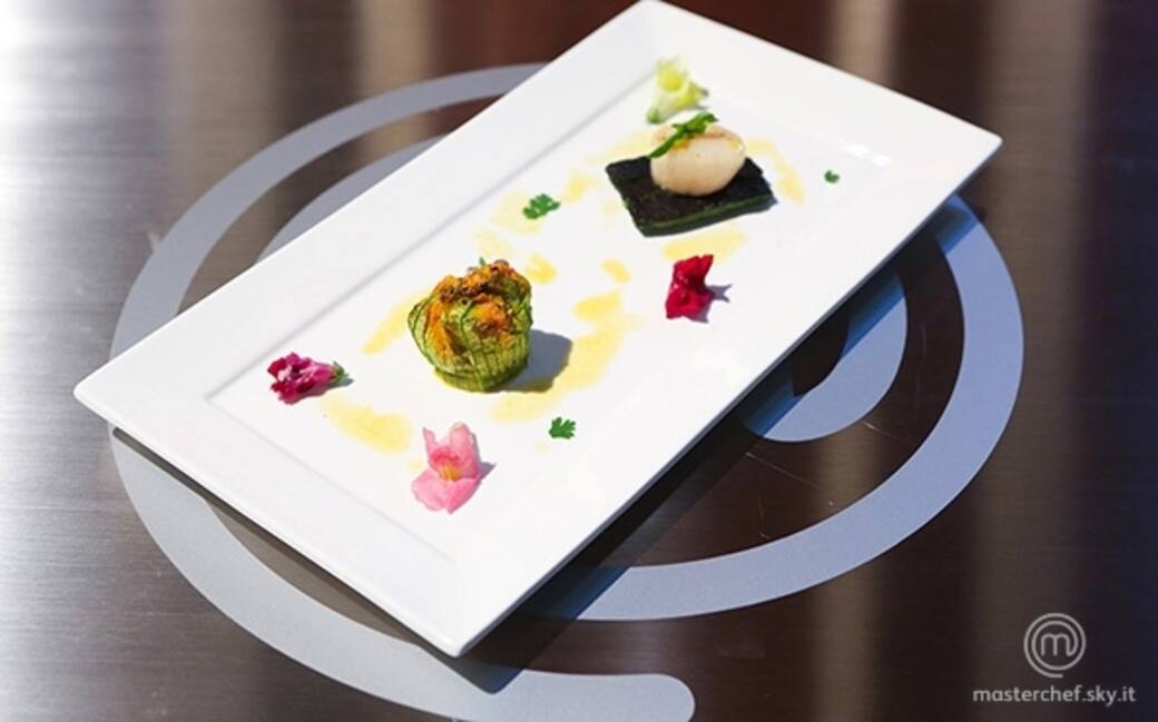 Impiattare tre bastoncini di zucchina, adagiare la capasanta scottata sopra. Accanto mettere il fiore farcito e nappare con l'emulsione al passion fruit. Decorare con i fiori eduli.