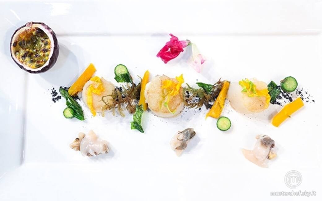 Impiattare su piatto rettangolare mettendo sotto una striscia di canna bruciata, le 3 capesante con in mezzo zucca con olio e sale tagliata a listarelle, il basilico e il muschio, sopra coriandolo. Disporre le striscioline di fiore sopra le capesante. Nell'angolo il passion fruit. Disporre davanti le capesante i tartufi di mare. Spargere in modo casuale tra le capesante i dadolini di zucchina.