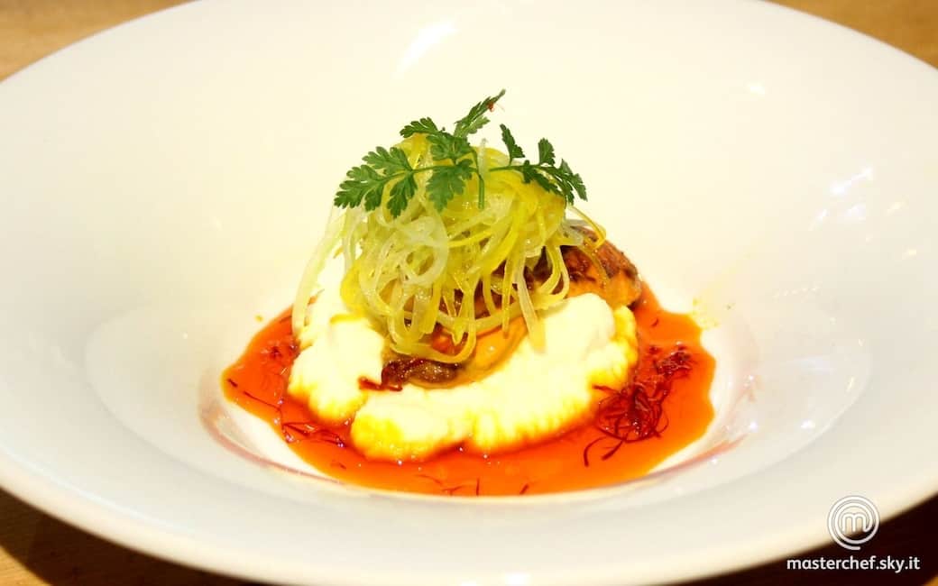 Mettere nel piatto il purè con sopra le capesante. Scolare la rapa dal ghiaccio, condire con l’olio di limone e metterla sopra le capesante. Spargere intorno il restante aspretto allo zafferano.