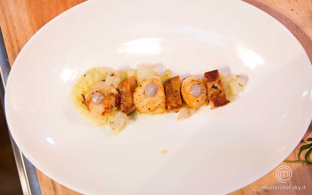 Pulire le capesante, salarle, peparle e scottarle in una padella con un filo d'olio extravergine di oliva molto caldo su entrambi i lati per circa 50 secondi.
