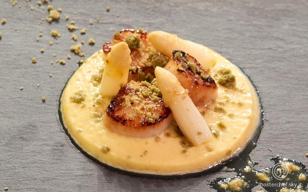Impiattare la crema di asparagi con l’ausilio di un ring circolare, adagiare le capesante e le punte di asparagi. Aggiungere una spolverata di crumble agli spinaci e aggiustare di olio evo, sale e pepe.