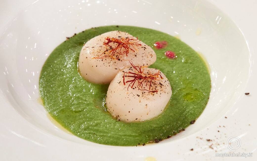 Impiattare versando un letto di crema di cavolfiori, aggiungere le due capesante e decorare con pistilli di zafferano. Aggiustare di olio evo, sale e pepe.