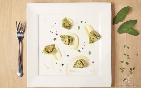 Stendere a pettine con un cucchiaio la salsa di patate. Posare i cappellacci sopra la salsa e condire con un cucchiaio di sugo di salama. Terminare il piatto aggiungendo la maggiorana e due fiorellini di salvia.