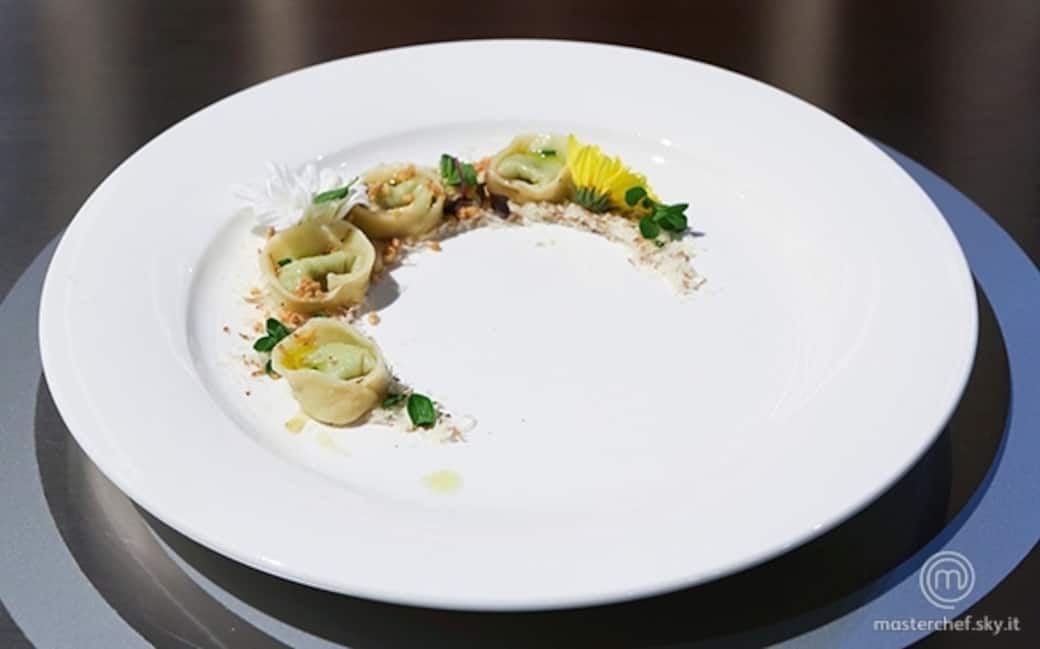 Stendere finemente la sfoglia, tagliare dei dischi con un coppapasta, farcirli con il ripieno freddo usando una sac a poche. Richiudere a mezzaluna e formare i classici cappelletti sigillando gli angoli opposti.