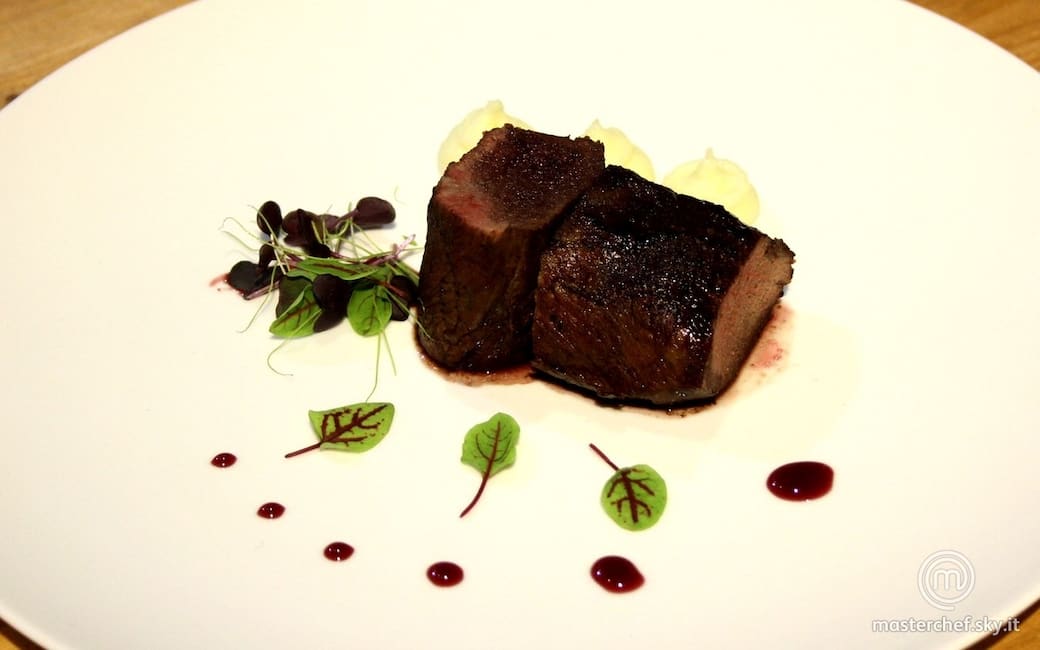 Sfornare il capriolo e porzionare. Spennellare il piatto con il brulè, creare delle gocce di purè e adagiarvi sopra il capriolo