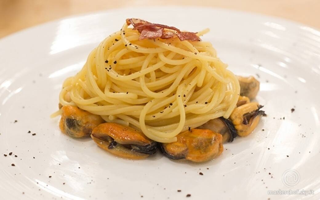 Una volta che la pasta è cotta mescolare insieme ai tuorli d'uovo. Creare nel piatto una base di cozze, adagiarvi sopra gli spaghetti, il prosciutto crudo e una spolverata di pepe. Aromatizzare con pizzico di polvere di caffè.