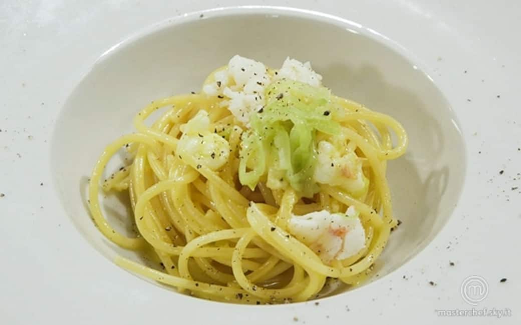Fare un nido di vermicelli, guarnire la sommità con la polpa degli scampi, i porri e una spolverata di pepe.