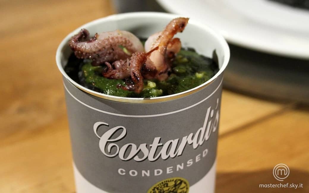 Impiattare all’interno della lattina: sul fondo disporre il pesto e la scorza di limone, aggiungere il riso con l’aiuto di un imbuto a bocca larga, altro pesto, altra scorza di limone e i tentacoli di calamaro scottati in padella. Aggiungere qualche cristallo di Sale Maldon, una grattata di pepe e finire tutto con un filo d’olio evo.