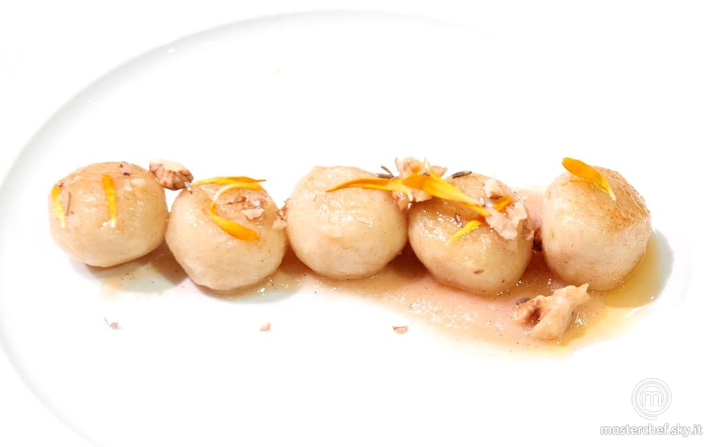 Disporre 5 gnocchi per piatto, adagiati sulla crema di pera e vaniglia e decorare con i fiori secchi.