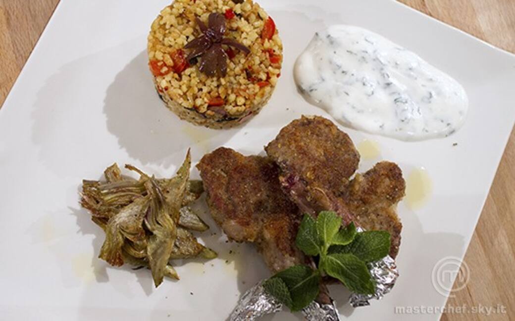 Impiattare mettendo uno sformatino di fregola, le costole con contorno di carciofi e un ciuffetto di menta. Accompagnare il tutto con due cucchiai di yogurt precedentemente frullato con la menta.