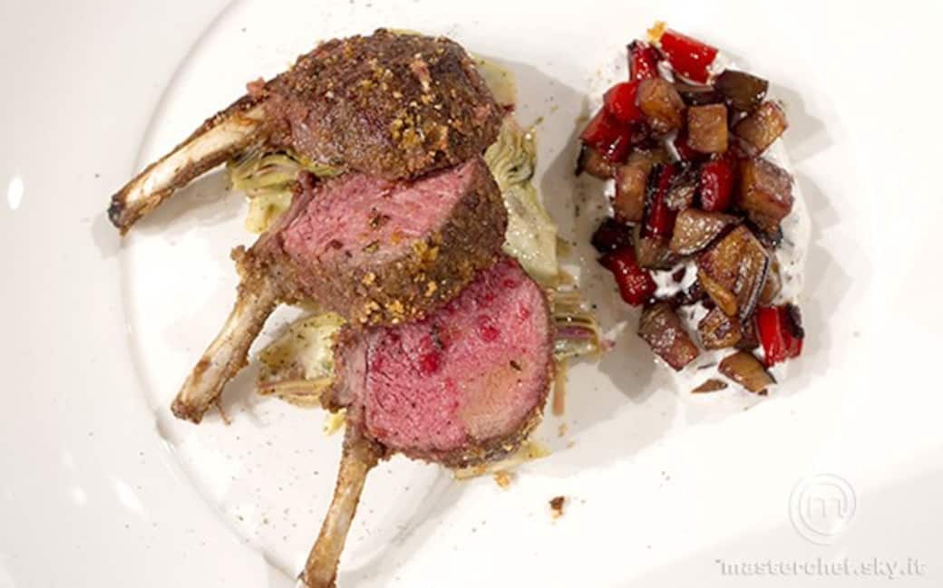 Impiattare sistemando un letto di carciofi e sopra un mezzo carré scaloppato, a lato stendere un cucchiaio di salsa allo yogurt e sopra due cucchiai di caponata. Infine mettere un filo d’olio sopra il carré e terminare con una grattata di pepe.