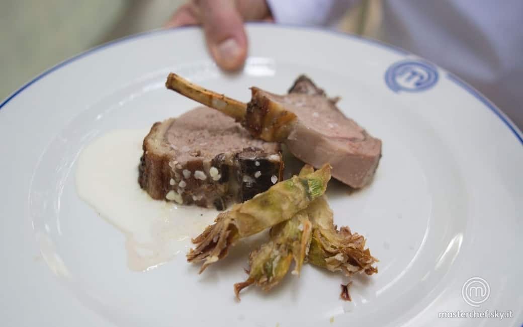 Porzionare il carrè e impiattarlo con qualche carciofo fritto e un cucchiaio abbondante di fonduta. Salare con fiocchi di sale Maldon.