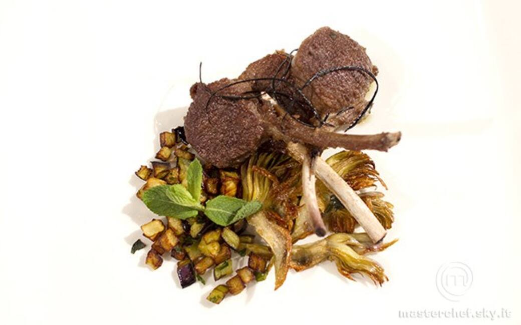 Mettere le verdure nel piatto, quindi appoggiarci sopra il carré. Guarnire con i cappellini di melanzana fritti.