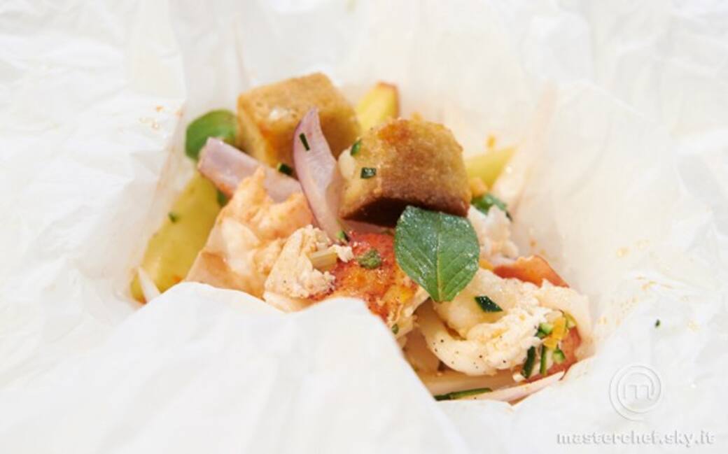 Tagliare la cipolla di tropea a striscioline e inserirla in una pirofila insieme all’astice tagliato a pezzi grossi. Aggiungervi il pane croccante rosolato, la pesca acerba precedentemente tagliata a pezzettoni, le verdure precedentemente marinare, qualche foglia di menta e le erbe aromatiche. Aggiungere l'olio evo e mescolare il tutto. Inserire in un foglio di carta da forno da utilizzare come cartoccio.