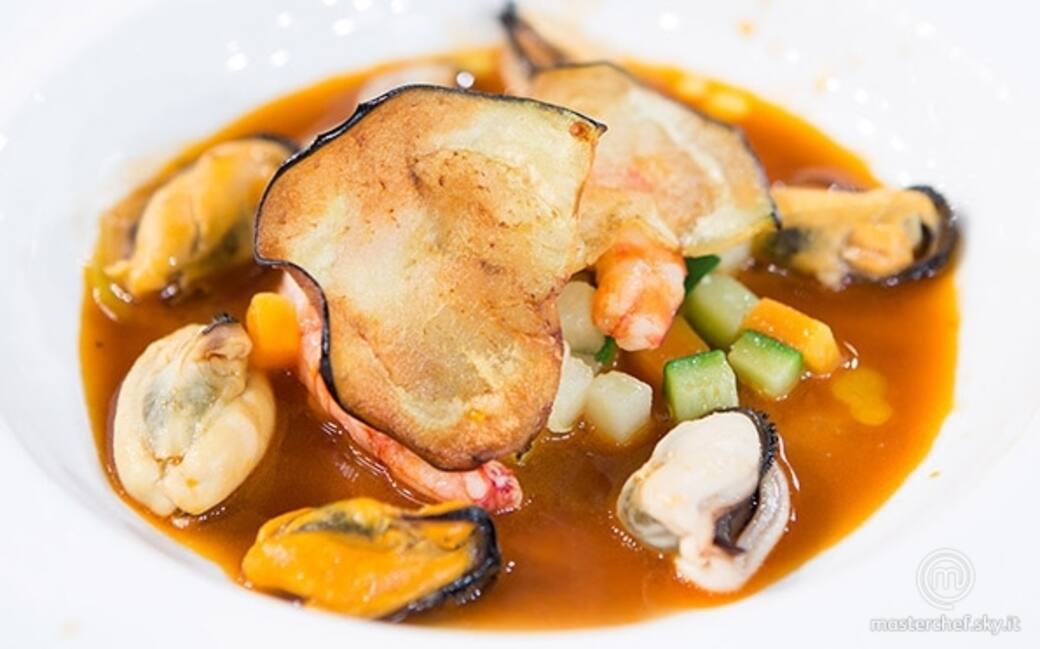 Condire la catalana di verdure con un filo d'olio, un filo d'aceto, sale e pepe. Comporre il piatto mettendo sul fondo il guazzetto di teste, quindi adagiarvi cozze e vongole con la dadolata di catalana e in cima i gamberi glassati; finire il tutto tagliando la melanzana a dischi molto sottili, poi friggerli fino a ottenere delle chips. Appoggiare queste ultime delicatamente sopra ai gamberi.