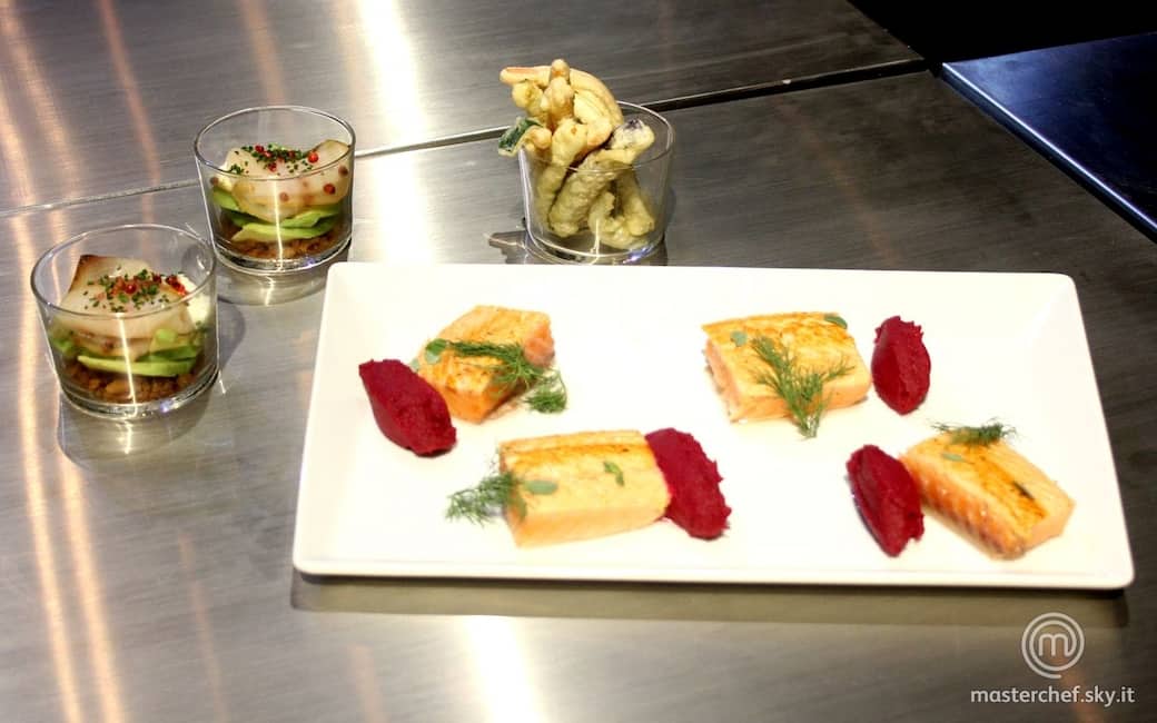 Tagliare le zucchine, le carote, le melanzane a losanghe. Immergere le verdure nella pastella e poi subito nell’olio caldo. Scolare su carta paglia. Sfornare il salmone dal forno e porzionare.