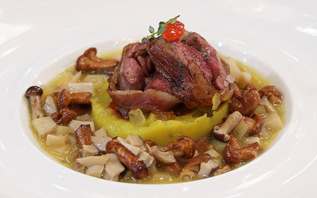 Per il piccione: prelevare i petti, condirli con timo, pepe e sale e avvolgerli con la pancetta. Cuocere nel burro e nel timo.