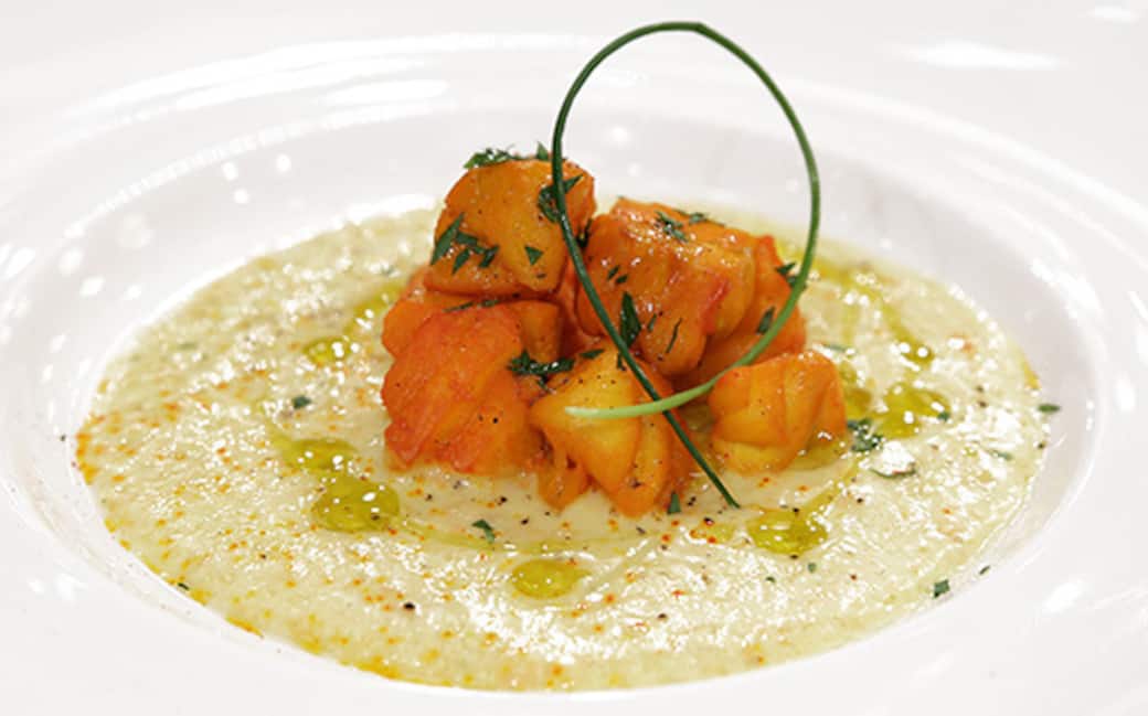 Il piatto: creare una base con la crema di pomodori. Adagiare sopra la crema in bocconcini di cernia e condire con olio, sale e pepe.