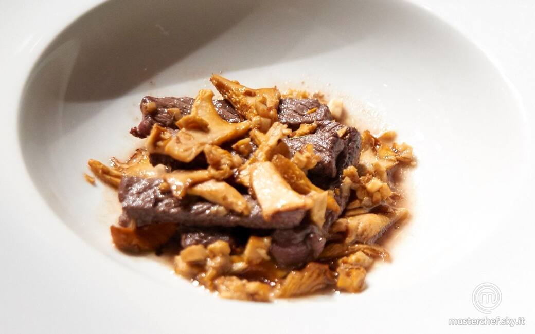 Impiattare il cervo e sopra i finferli. Aggiustare di sale e pepe.