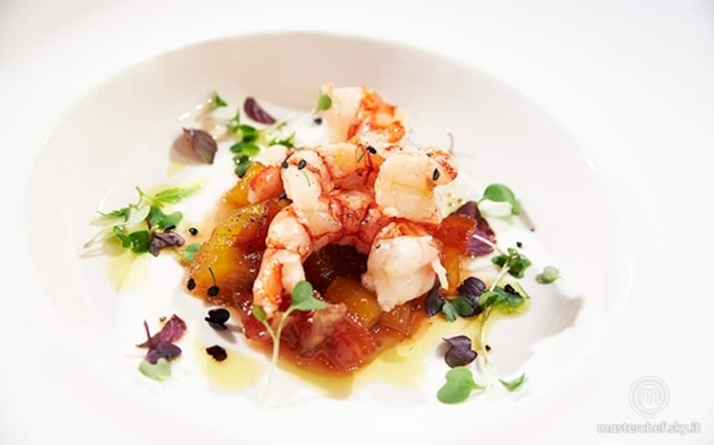 Portare a cottura il composto in una casseruola per ottenere il chutney. Mettere a scaldare una padella con olio e spicchio d’aglio in camicia. Pulire i gamberi e saltarli in padella aggiustando di sale e pepe.
