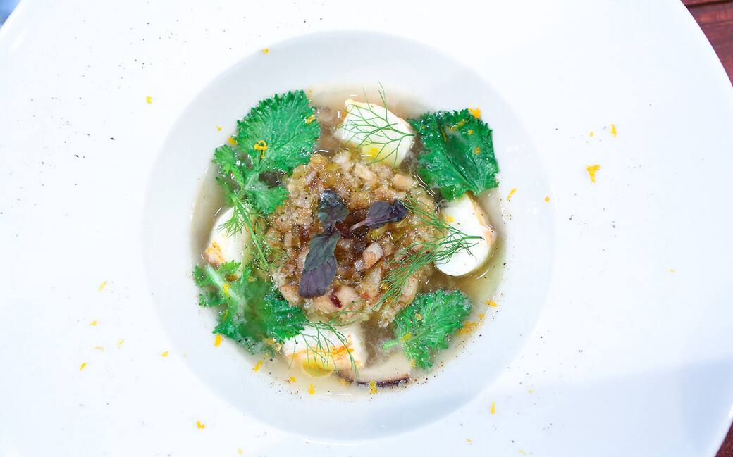 Al centro di una fondina, aiutandosi con un coppapasta, formare un disco con il chutney di trippa. Disporre attorno 4 dischetti di aragosta, 4 fette di funghi e 4 foglie di cime di rapa. Decorare l'aragosta con le barbe del finocchio e la trippa con alcune foglie di basilico viola. Grattugiare la scorza di arancia sul guazzetto e terminare con pepe e qualche goccia di olio evo.