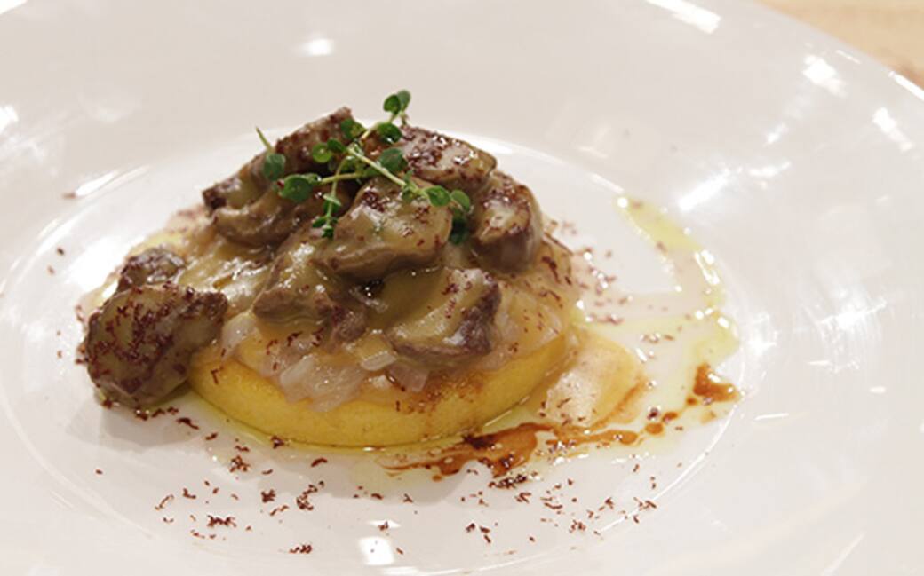 Passare la polenta in una padella rovente con olio e creare la pellicina. Impiattare e mettere le cipolle stufate sopra al disco di polenta. Sopra alle cipolle adagiare lo spezzatino di lepre e condire con salsa di arancia e un filo d'olio.