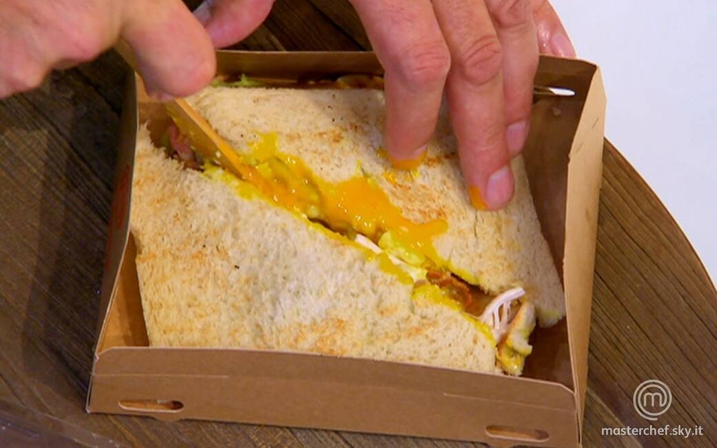 Comporre il sandwich disponendo alla base uno strato di salsa guacamole, sopra gli straccetti di pollo grigliati, una foglia di lattuga, l’uovo e il bacon.