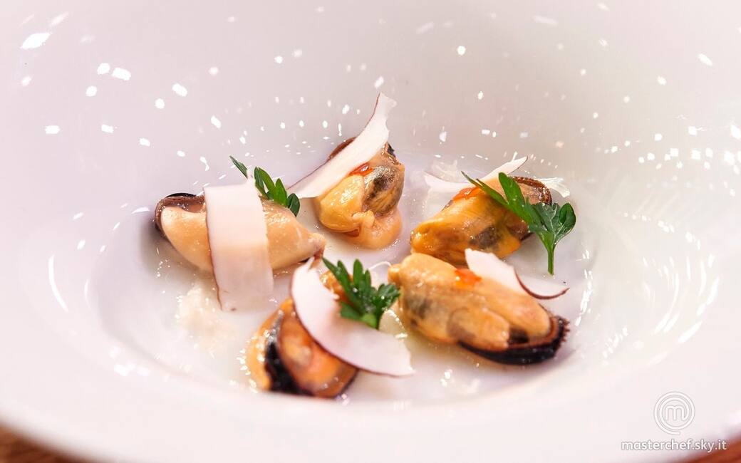 Disporre 5 cozze per piatto, qualche “granello” di polpa di lime e delle gocce di acqua di cozze. Aggiungere l’acqua di cocco (precedentemente filtrata), delle scaglie di cocco prelevate con il pela verdure, qualche fogliolina di prezzemolo e dei pezzettini di peperoncino candito.