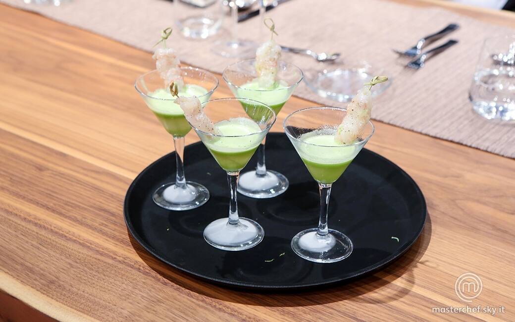 Versare il cocktail nelle coppe martini, immergervi gli scampi infilzati nei bastoncini da spiedini e completare con una grattugiata di scorza di lime.