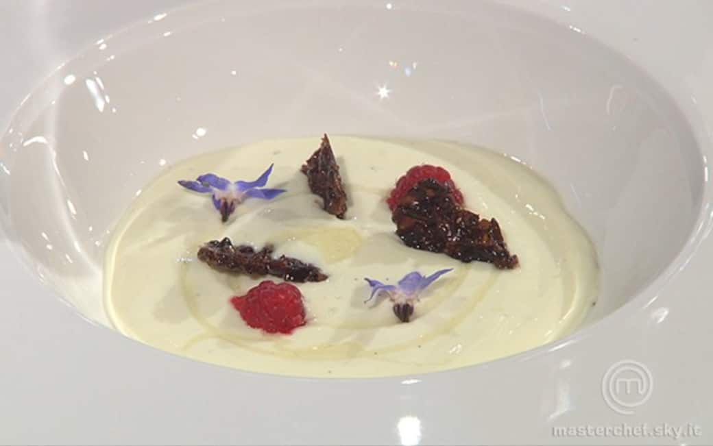 Miscelare la crema inglese, realizzata precedentemente facendo bollire nel latte 6 rametti di basilico fresco, con il mascarpone e montare alla frusta. Lasciar raffreddare, incorporare alla miscela 1/3 di yogurt greco e lasciar riposare a circa 4° gradi.